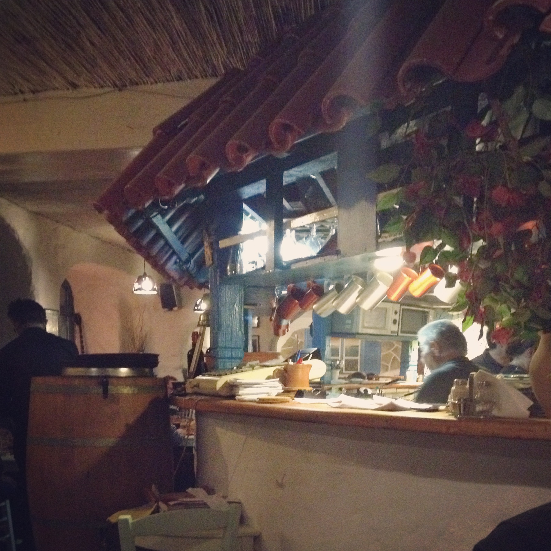 Außerdem kann die rustikale Art der Einrichtung und der (Essens-)Anrichtung dem einen oder anderen vielleicht etwas missfallen. Es gibt keine extra Küche sondern gekocht wird hinter der zum Ambiente passend abgetrennten Theke. Die Speisen kommen ohne recht viel Schnickschnack auf den Tisch. Hier muss ich aber eindeutig sagen, wir befinden uns in einer Taverne und nicht in einem Restaurant. Eventuell könnte man das auch beim Thema Wein sagen? Egal, für mich ist es so genau richtig um einen entspannten und „ungestelzten“ kulinarisch pefekten Abend verbringen zu können.