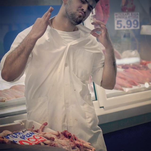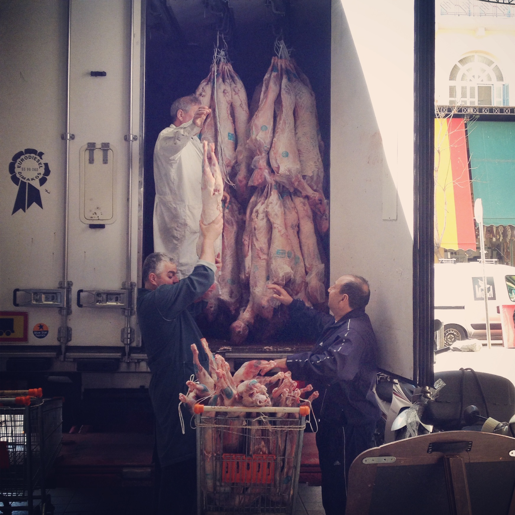 Trotz allem überzeugt das Gesehene durch die Authentizität. Wie am Tag zuvor besuchten wir wieder die gleiche Taverne um uns das Schauspiel anzusehen. Das ist sicherlich nicht für jeden, sollte man aber schon mal gesehen haben. Das Gebotene ist irgendwo zwischen interessant, grotesk und gnadenlos ehrlich einzuordnen. Da steht auch schon mal der Metzger vom Stand nebenan mit blutverschmierter Schürze neben dem Tisch und unterhält sich mit dem Wirt. Wir ließen uns Bauernsalat, gegrillten Oktopus, gefüllte Aubergine, vegetarischen(!) Augenbohnensalat, Tsatziki und Weißwein schmecken. Da hier hauptsächlich(?) die Metzger und Händler bzw. zur späteren Stunde einheimische Nachtschwärmer essen, bekommt man echte und einfache aber sehr gut schmeckende Küche.