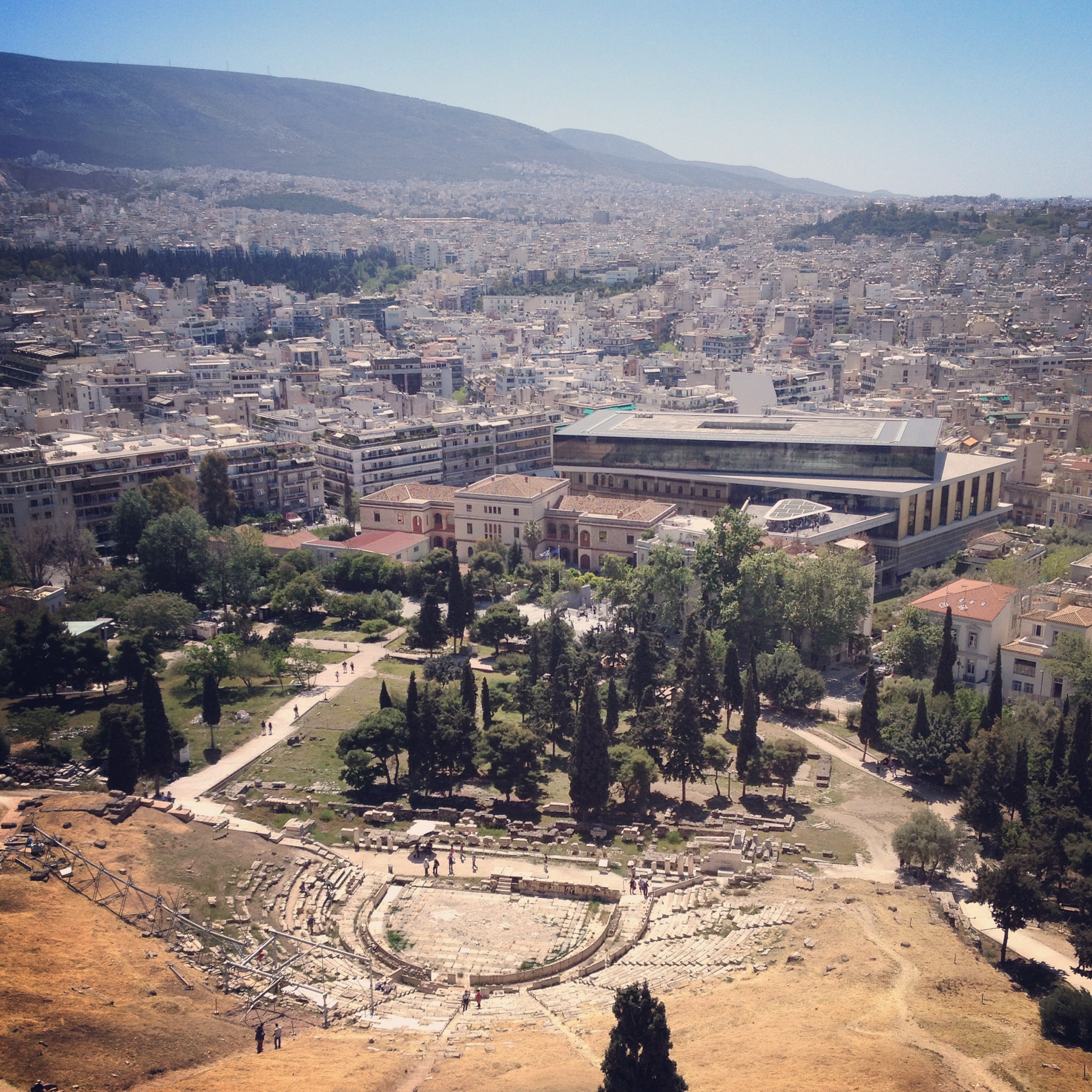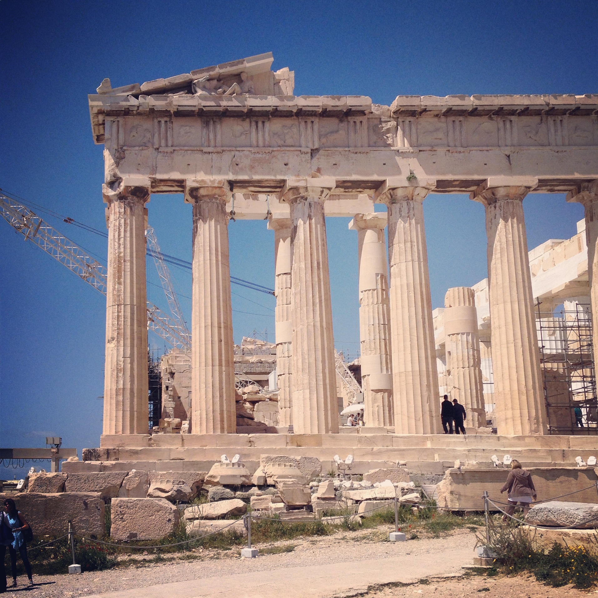 Erhöht über der Stadt, nachts beleuchtet, auf Schildern ausgezeichnet und durch Reisegruppen ge(kenn)zeichnet. Die Akropolis. Noch so ein Berg, der bestiegen sein will oder besser muss. Aber hier muss man sicher mal gewesen sein. Am besten am frühen Vormittag, bevor die unzähligen Reisegruppen aus ihren Bussen steigen und farblich sortiert die antike Stätte stürmen. Wenn man die berühmten, von unzähligen Besuchern glatt geschliffenen, Stufen der Propyläen hinter sich gelassen hat, sieht man die beeindruckenden Überbleibsel einer vergangenen Zeit. Die Baugerüste und die helleren, d.h. neuen Steine, und natürlich die Touristen beenden aber die kurzzeitige Zeitreise recht schnell. Dazu kommt eine, auch jetzt Ende April schon, hell scheinende Sonne kombiniert mit einem wolkenlosen Himmel was mich den spärlich vorhandenen Schatten suchen ließ.