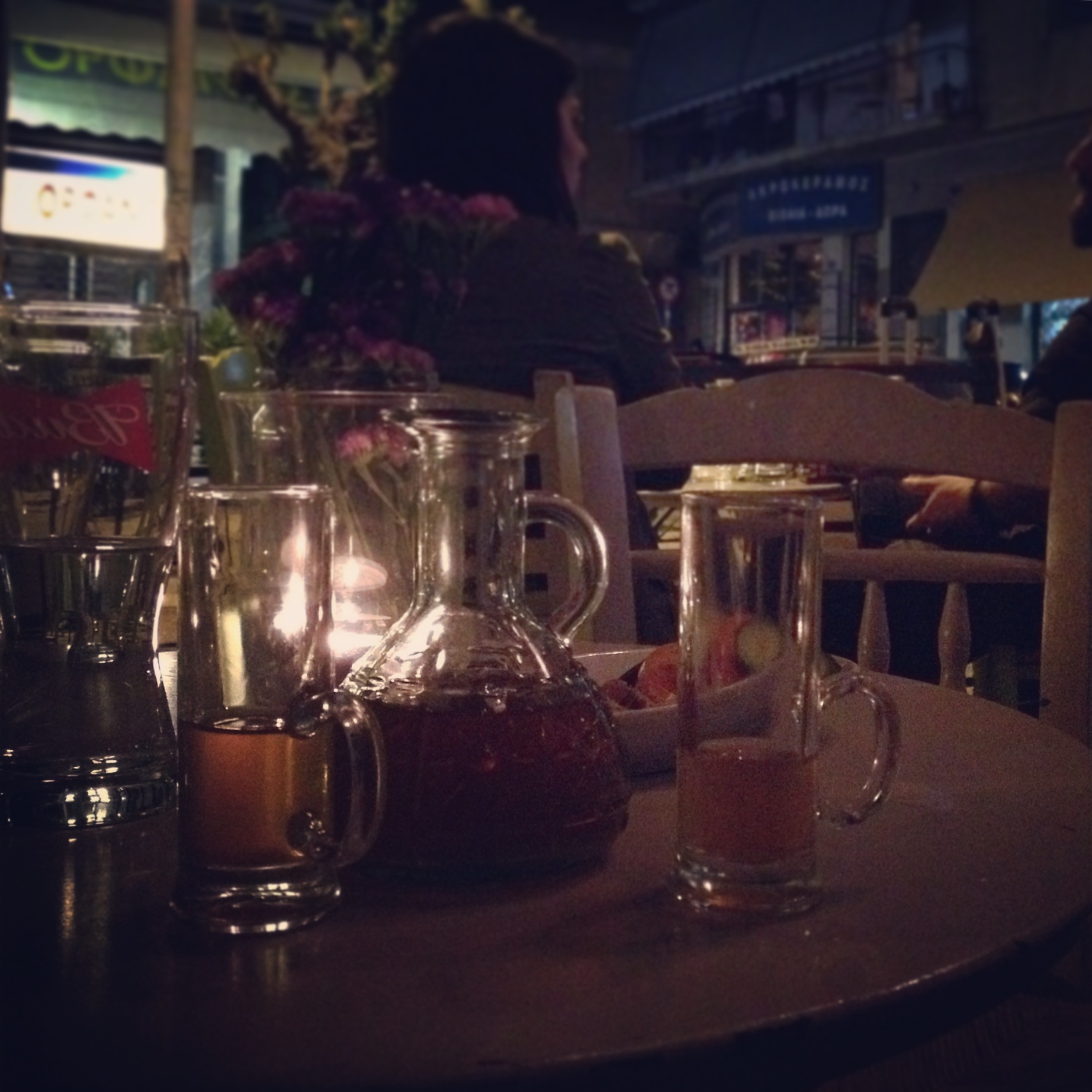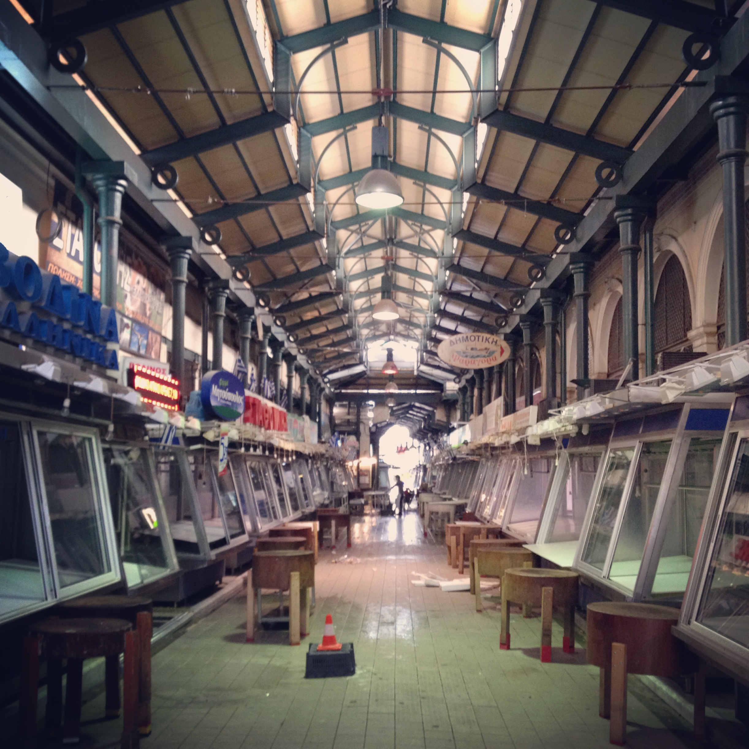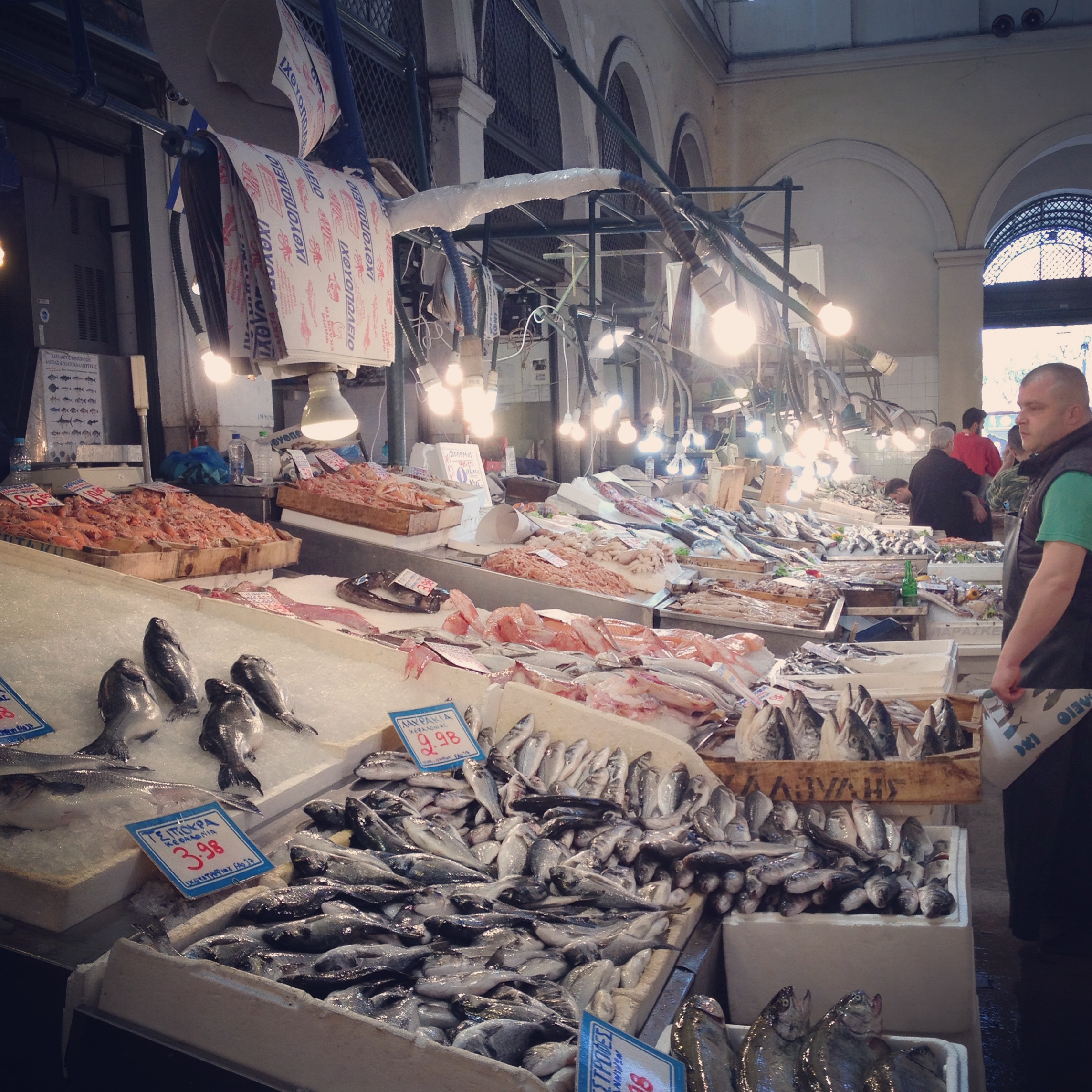 Etwas ziellos wurde in den Straßen umhergestreift, dies und das gesehen, manches probiert. Unter anderem Freddo Cappuccino, die griechische Variante eines Iced Cappuccino. Gegen Abend hin ging es in die Markthalle. Da der Tag doch schon etwas fortgeschritten war, hielt sich das Treiben in Grenzen. Nach einem kurzen Rundgang und einem nicht nur wohlschmeckendem sondern auch authentischem Abendessen mit Fava, marinierten Sardinen und natürlich Weißwein in einer der Tavernen wurde aber ein weiterer Besuch am Vormittag fest eingeplant. Dazu später mehr.