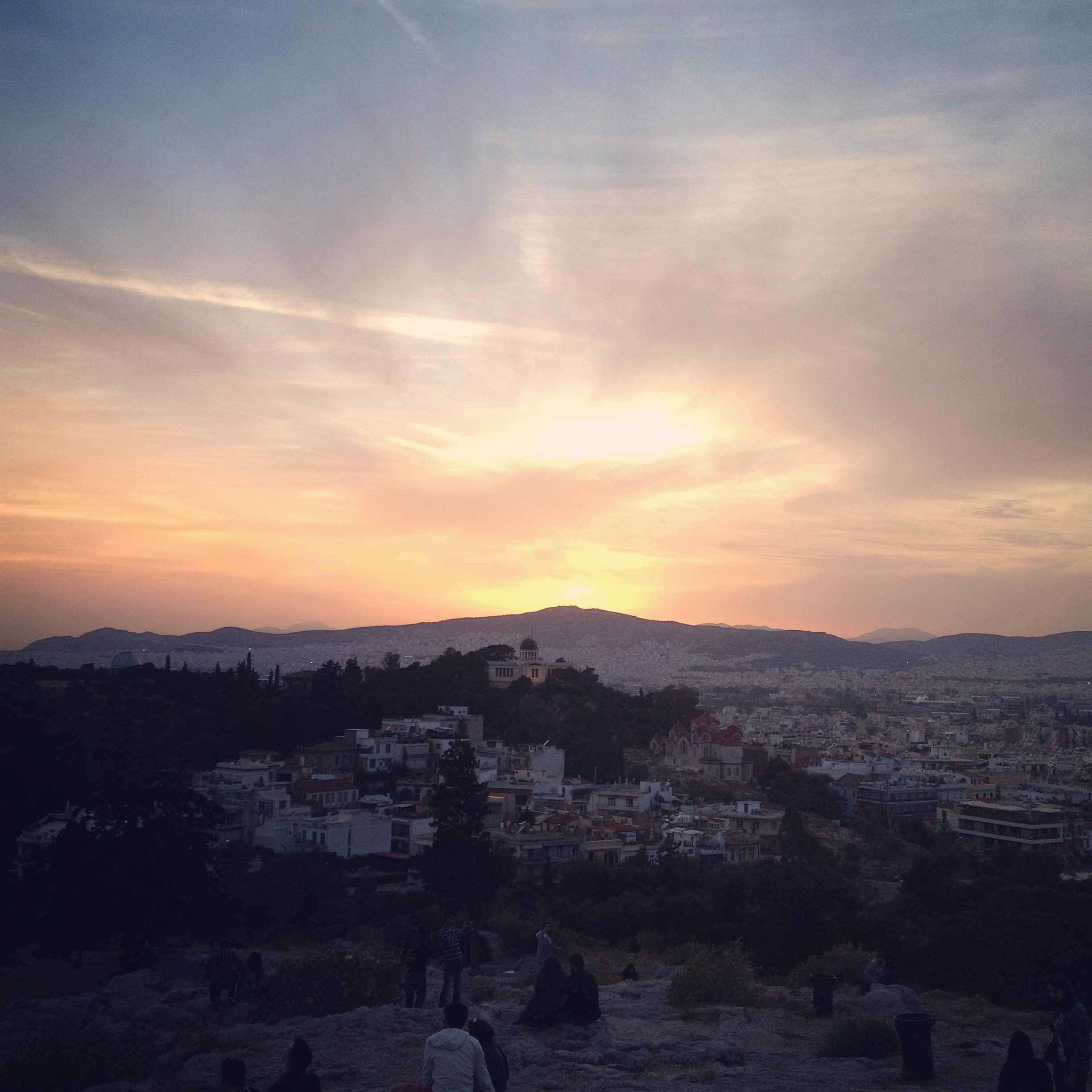 Zurück ging es mit Blick auf die Akropolis über die lange Gerade der Straße Eolou, welche hauptsächlich eine Fußgängerzone ist. Diese endet im Altstadt-Viertel Plaka. Der anschließende Gang durch das kleine Viertel Anafiotika ließ durch die dort herrschende Kykladenarchitektur schon einen Vorgeschmack auf die kommenden Inseln zu. Ziel war der Areopag. Ein Felsen auf dem früher der oberste Rat tagte und von welchem heute ein wunderbarer Rundblick auf Athen und die Akropolis möglich ist. Gerade zum Sonnenuntergang herrscht eine schöne Stimmung. Ein traumhaftes Ende für den ersten Tag in Athen.