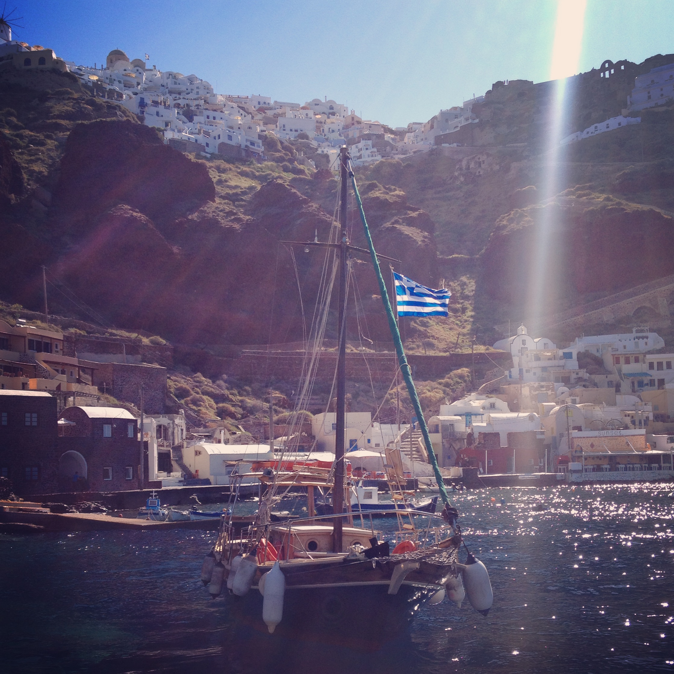 Eine Bootstour war hier natürlich auch Pflicht. Nach meinen nicht so tollen Erfahrungen mit einer kleinen Yacht wurde diesmal ein klassisches Schiff gewählt. Ein traditioneller Schoner mit Segeln aber modern angetrieben mit Motor. In Verbindung mit der abwechslungsreichen Tour mit zwei Landgängen, war der Ausflug gut zu überstehen. Los ging es im Hafen Ammoudi direkt unterhalb on Oia immer direkt an der schroffen Steilküste entlang zum alten Hafen direkt unterhalb von Fira. Nicht nur die hochaufragenden Felsen sondern das ganze Ensebmle ist wirklich einzigartig beeindrucken. Allein schon wie die Häuser in den Fels gebaut sind muss man gesehen haben. Es stiegen noch einige Passagiere zu und weiter ging es zu Nea Kameni, der Vulkaninsel in der Mitte des Kraters. Der erste Landgang führte uns durch eine Mondlandschaft aus dunklen Felsen und Geröll auf den Vulkankrater. Schlauerweise lief ich mit Badelatschen den Vulkan hoch, was kurz vor dem Ziel den Verlust des halben Zehennagels mit sich zog – nicht sehr nachahmenswert. Oben angekommen sah man dann die drei übrig gebliebenen Inseln von Santorini. Wird man sich dann bewusst, dass man so ziemlich direkt auf dem Vulkan steht, kommt zu dem einmaligen Blick noch ein auch einmaliges Gefühl dazu. Nächster Halt war für die Badefreunde gedacht. An einer Bucht der kleinen Insel Palea Kameni gibt es heiße Quellen. Schwimmen macht hungrig, der nächste Stopp löste das Problem. Die zweitgrößte Insel Therasia wurde angesteuert. Hier im kleinen Hafen Simantiri gibt es eigentlich nur Tavernen und für uns gegrillten Oktopus, Briam und Wein.