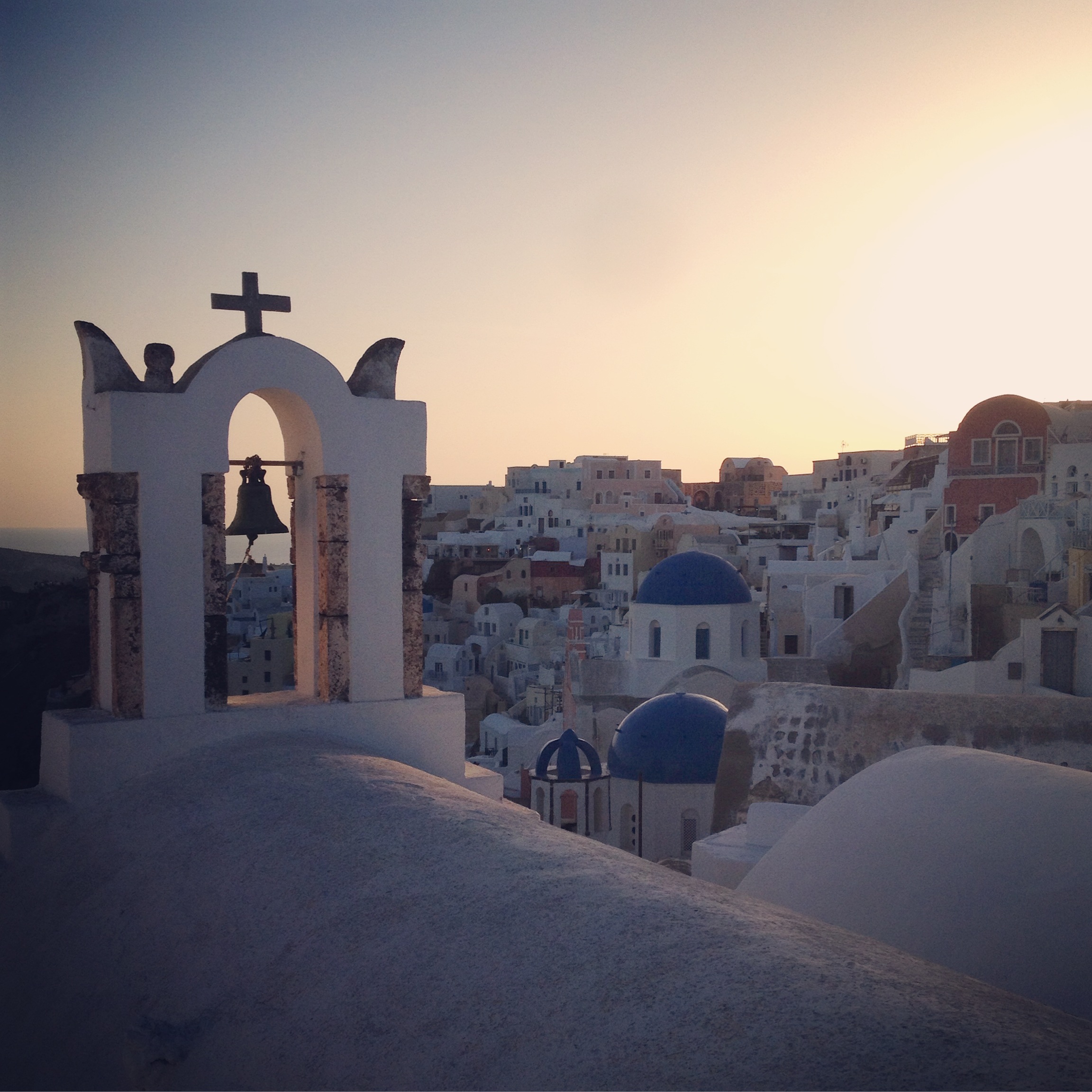 Bevor ich es vergesse: Sonnenuntergang. Schon mal davon gehört? Kann eigentlich nicht sein, denn anscheinend geht die Sonne nur auf Santorini unter. Zumindest sieht es so aus, wenn sich schon mehr als zwei(!) Stunden vorher die Menschenmengen durch die schmalen, von Nobelboutiquen gesäumten, Gassen drängen, immer auf der Suche nach einem guten Platz und immer die Gedanken von einem noch besseren Platz im Hinterkopf. Auf den touristisch geprägten Orten der Insel läuft dann ein imaginärer Countdown. Jede Minute wird ein weiterer guter Beobachtungsplatz besetzt. Kreuzfahrtreisegruppen werden sich spontan und bitter über den zu frühen Abfahrtstermin bewusst, Hochzeitsfotografen und Brautpaare geraden in Aufregung, Tagestouristen müssen diese eine Chance nutzen, die Anspannung steigt mit der Erwartungshaltung. Erwarten bedeutet aber erstmal warten, quälend langsam nähert sich die Sonne dem Meer, bis sie dann endlich, je nach eigener Position, im Meer oder hinter den Häusern verschwindet. Ein Spektakel welches fast schon mehr durch die Aufregung darum als von sich selbst lebt. Wobei es natürlich wunderschön ist, das ganze Ensemble wird in ein einzigartiges Licht getaucht, überhaupt wird alles farbig. Im Licht der untergehenden Sonne werden die Zuschauer in den Gassen und auf den Mauern und Dächern zu Silhouetten und für einen kurzen Moment herrscht eine andächtige Stille. Tipp: Nicht immer nur den direkten Sonnenutergang anschauen sondern währenddessen auch mal durch die Gassen von Oia oder Immerovigli/Fira laufen. Hier herrscht dann eine ganz bezaubernde Stimmung.